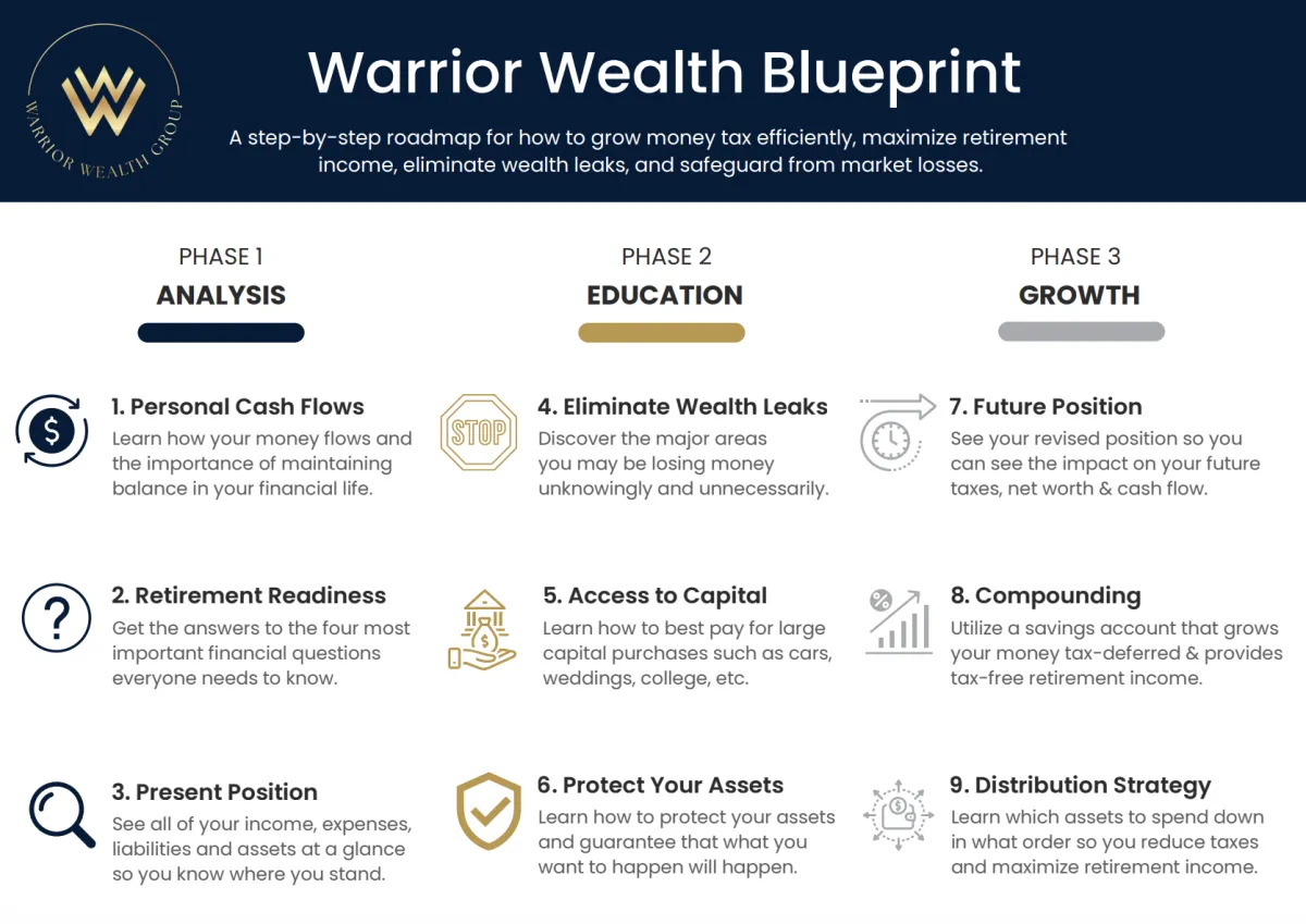 The Warrior Wealth Group is a financial firm headquartered in San Diego, CA and Los Cabos, Mexico. We serve military leaders who dedicated their lives to service, by delivering mission-ready retirement and legacy strategies that honor your service and prepare you for your next chapter. Our Warrior Wealth Blueprint is a proven method for creating a secure retirement income.