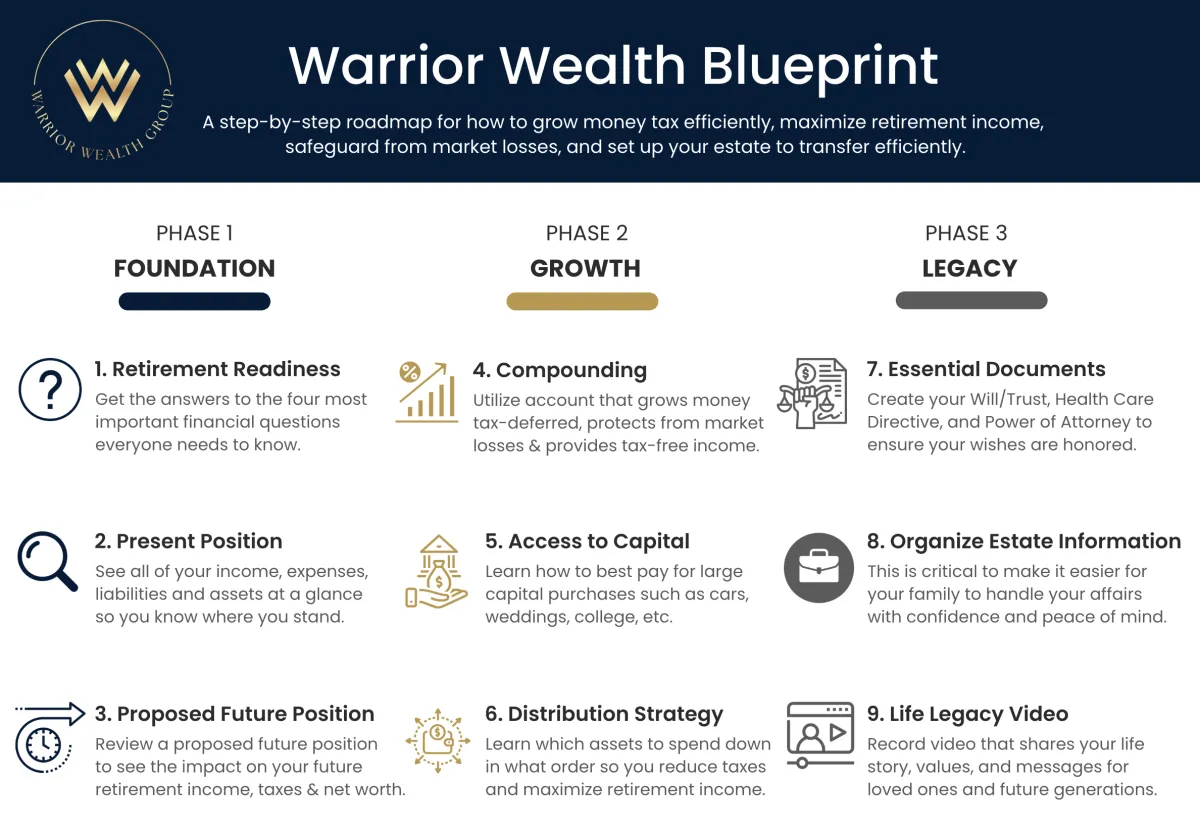 The Warrior Wealth Group is a financial firm headquartered in San Diego, CA and Los Cabos, Mexico. We serve military leaders who dedicated their lives to service, by delivering mission-ready retirement and legacy strategies that honor your service and prepare you for your next chapter. Our Warrior Wealth Blueprint is a proven method for securing your retirement income and legacy.